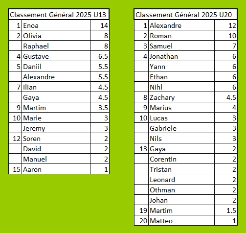 2025 – Juniors U13+U20 – Classement Général